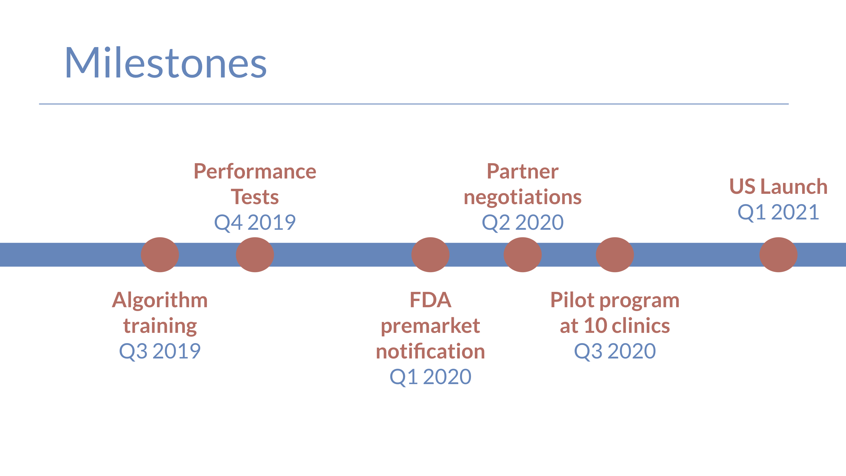 We calculated the financials by estimating the cost of salaries, manufacturing, marketing, consulting etc. I even went through the prices of tests required to apply for the FDA 510(k) Premarket Notification, selecting the ones relevant for our Class II medical device. The average wait time of its approval is only one example of what we considered when preparing our milestones.